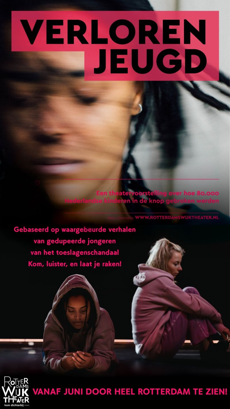 Op 8 juni 2024 ging de voorstelling 'Verloren Jeugd' in première bij het Rotterdams Wijktheater. Ik heb de toneeltekst geschreven, op basis van interviews met (uithuisgeplaatste) kinderen van gedupeerde ouders van het Toeslagenschandaal.